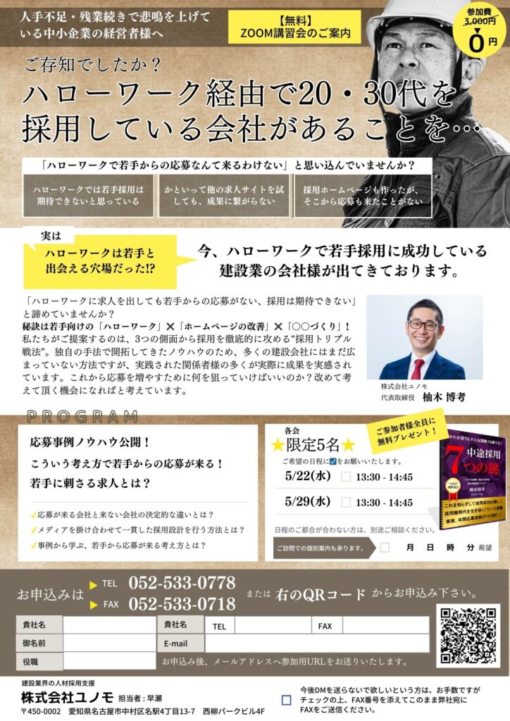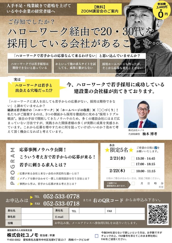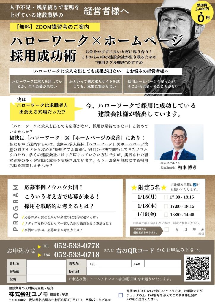 【無料Zoomセミナー】「ハローワーク✖ホームページ採用成功術~建設部門~」セミナー開催 - 2024年1月