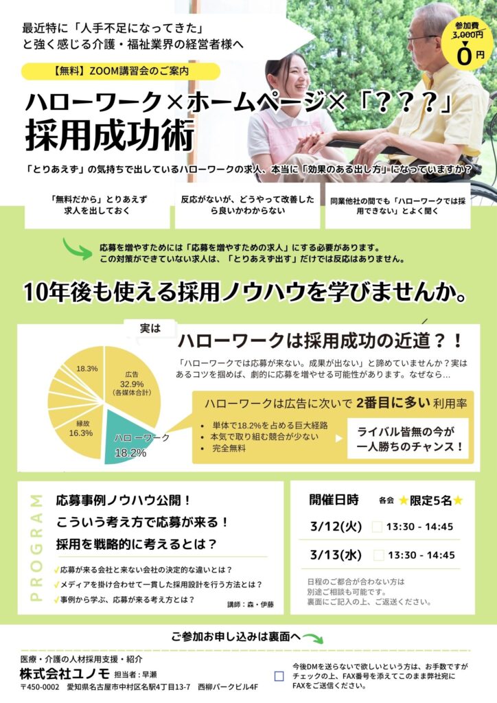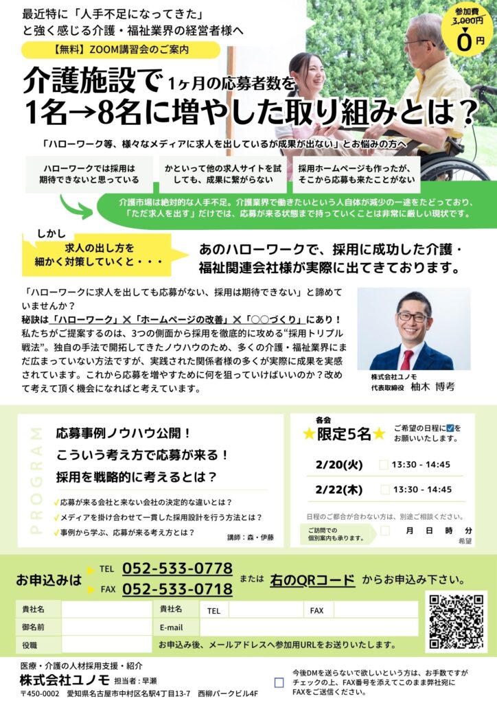 【無料Zoomセミナー】「介護施設で1ヶ月の応募者数を1名→8名に増やした取り組みとは?」セミナー開催 - 2024年2月