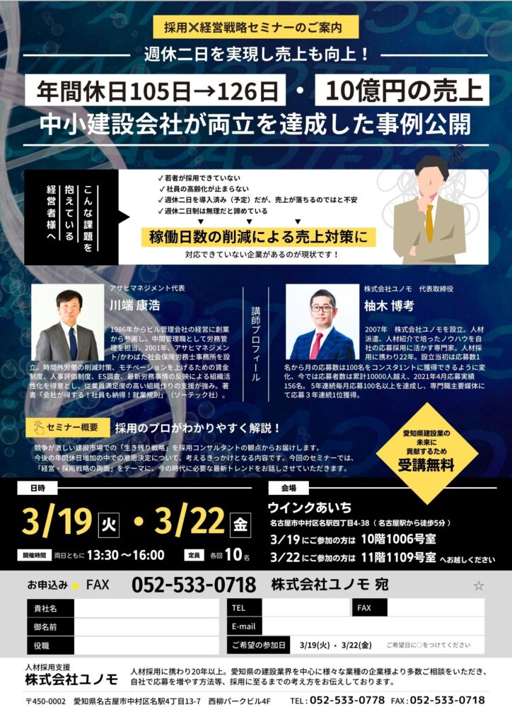 「採用×経営戦略 週休二日を実現し売り上げも向上した事例公開」セミナー会場開催 - 2024年3月