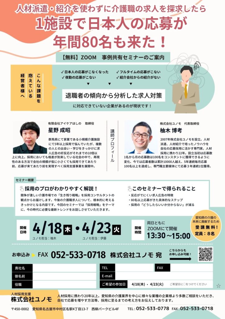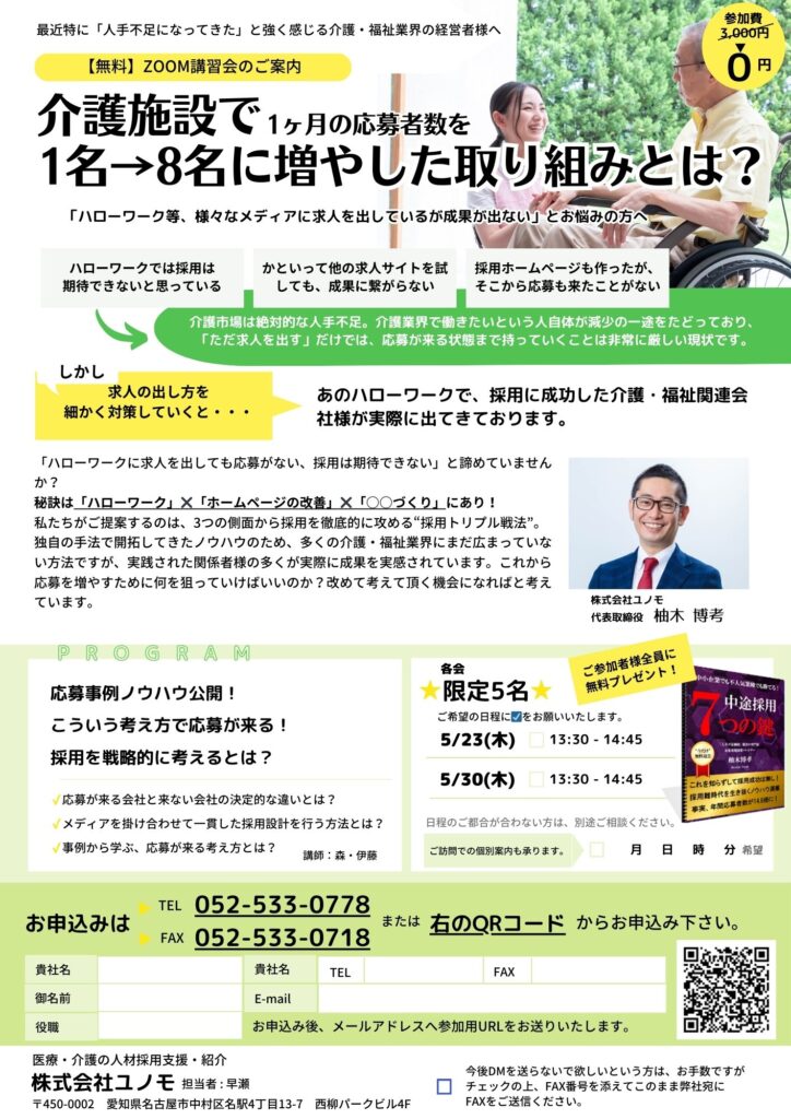 【無料Zoomセミナー】「介護施設で応募者数1名→8名に増やした取り組みとは?」セミナー開催 - 2024年5月