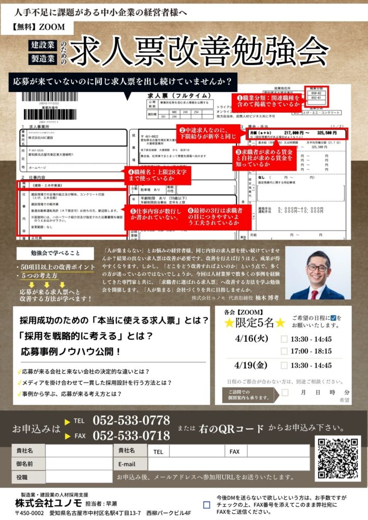 【無料Zoomセミナー】「建設業・製造業のための求人票改善勉強会」開催 - 2024年4月