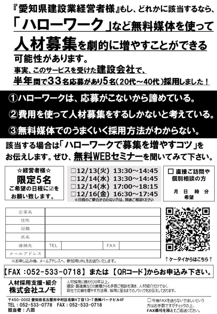 2022年12月「ハローワーク等の人材募集事例」無料webセミナー開催のお知らせ