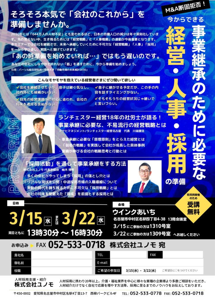 2023年3月「長く経営していくための経営戦略・採用戦略の考え方」セミナー会場開催のお知らせ
